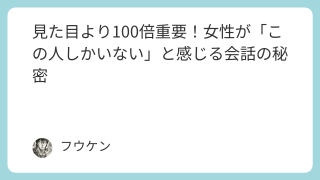 こんにちは!フウケンです!突然ですが、あなたに一つ質問があります。「女性にモテるために、一番大切なことは何だと思いますか?」…なんて聞くと、「そりゃ、イケメンであることだろ!」「いや、金だ!」「ファッションセンスとかじゃない?」いろんな声が...